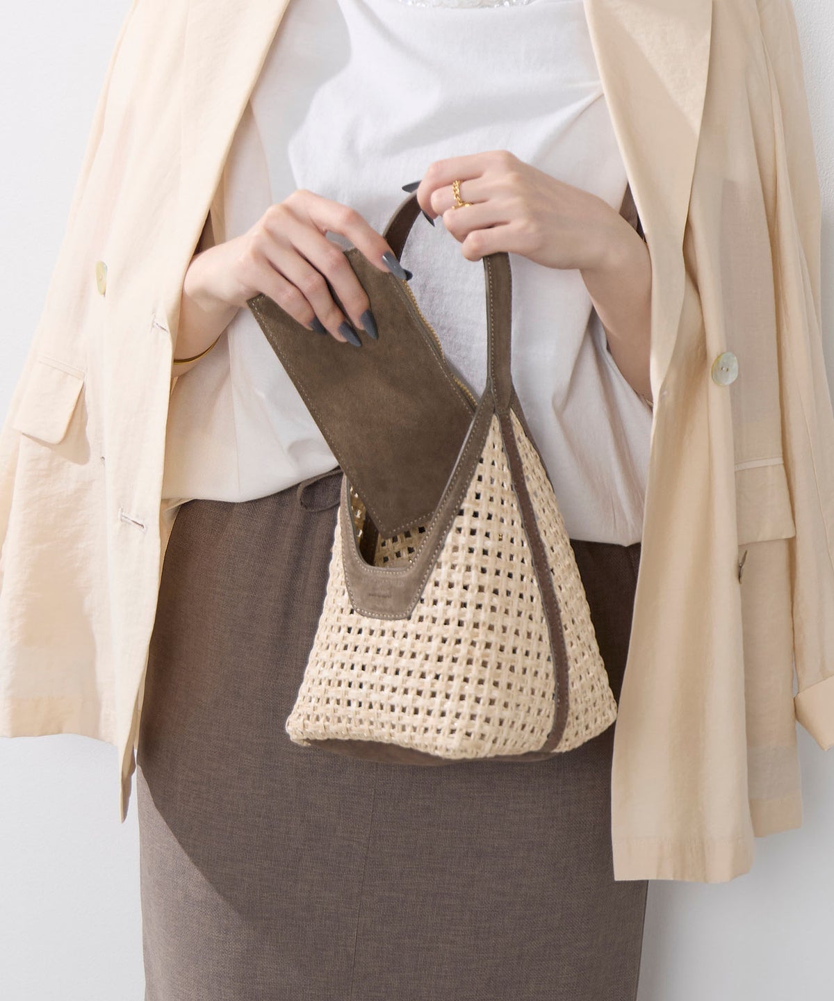 他の画像を見る 【VIOLAd'ORO】ラフィア調2WAYレザー金具付きショルダーバッグ-SANDRO ¥ 27,500 税込 販売期間 2026/03/06 10:00 〜 カートに入れる お気に入りに登録する