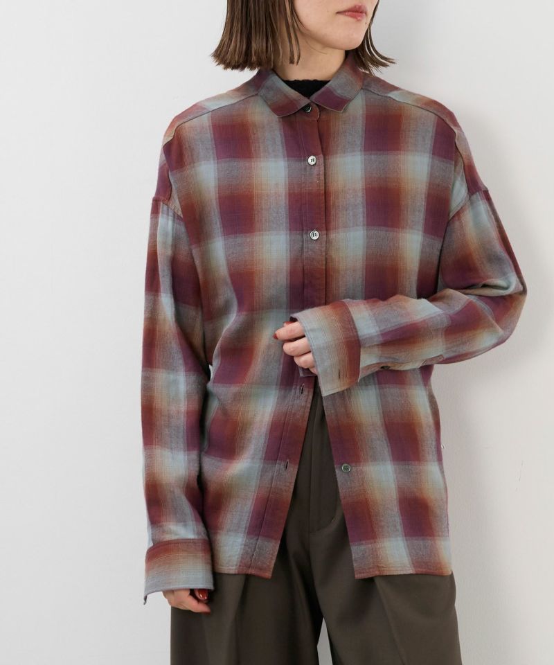 秋冬の着こなしのアクセントに、ワードローブに加えたい大人のチェックシャツ。繊細な色の組み合わせのオンブレチェックシャツ。カジュアルながらも羽織としてももちろん、肌寒くなればニットの下などインナーとしてのアクセントとしても合わせやすい一枚。後ろのタブとボタンを留めれば、ウエストがシェイプされた旬なシルエットを作り出せます。タブも切り替えの中に隠せる仕様になっているので、ボタンを留めない時はシンプルなシャツとしてお楽しみいただけます。【fabric】タテ、ヨコ共にレーヨン糸を使用した落ち感のある肌触り。太い糸を使用しているので膨らみのある生地感も特徴です。※こちらの商品は縫製後、製品洗いをしています。そのため1点1点に微妙な色、サイズ風合いなどの違いがあります。予めご了承くださいませ。※素材の特性上、洗濯や着用中の摩擦により表面が毛羽立ち、毛玉(ピリング)が生じます。連日の着用は避けて、着用後はブラシなどで表面を整えてください。--------------------------------------透け感:なし裏地:なし伸縮性:なし光沢感:なし生地の厚さ:普通--------------------------------------【coordinate】一枚でさっと着るのはもちろん、暑い時期にはTシャツの羽織や、腰巻きにしてコーディネートにアクセントを加えても◎肌寒い時期にはスウェットやニットのインナーとしても。一枚あればコーディネートの幅が広がるアイテムです。関連の特集ページはこちら▼秋めくRecommend スタイル5LOOKS★8月から9月におすすめのスタイル *商品画像はできる限り実物の色に近づけるよう徹底しておりますが、お使いのデバイスのモニター設定、お部屋の照明等の閲覧環境により実際の色味と異なって見える場合がございます。*画像の商品はサンプルです。実際の商品と仕様、加工が若干異なる場合があります。予めご了承くださいませ。