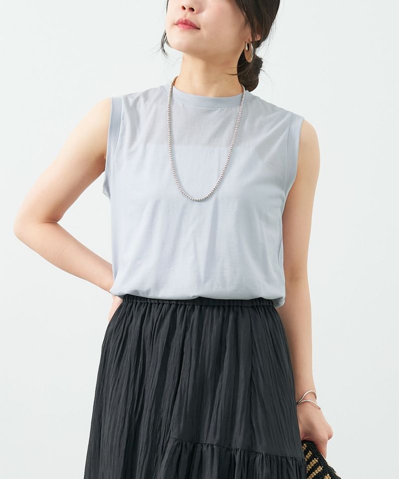 キャミワンピやジャケットなどのインナーに着やすいサイズ感のノースリーブTシャツ。ぴったりとし過ぎない身幅や腕が見えすぎない肩幅、ゆるっとしたアームホールなどサイズにこだわった一枚。スタイリングに軽さをプラスしてくれる便利アイテムです。カップ付きキャミやスクエア風タンクトップなどの着用がおすすめです。【fabric】細番手の綿にナイロンをカバーリングした糸を使用することで、細番手の繊細な表面感と程よく肌離れし、サラッとソフトな質感が魅力の素材になっています。肌あたりもよく、繊細なシアー感で大人の女性におすすめしたいシアーTEEです。※【デザイン変更有】後ろ襟のゴールドプレートが、画像よりも細めのゴールドプレートへ変更となります。 -------------------------------------- 透け感:あり 裏地:なし 伸縮性:あり 光沢感:なし 生地の厚さ:薄手 --------------------------------------*商品画像はできる限り実物の色に近づけるよう徹底しておりますが、お使いのデバイスのモニター設定、お部屋の照明等の閲覧環境により実際の色味と異なって見える場合がございます。*画像の商品はサンプルです。実際の商品と仕様、加工が若干異なる場合があります。予めご了承くださいませ。