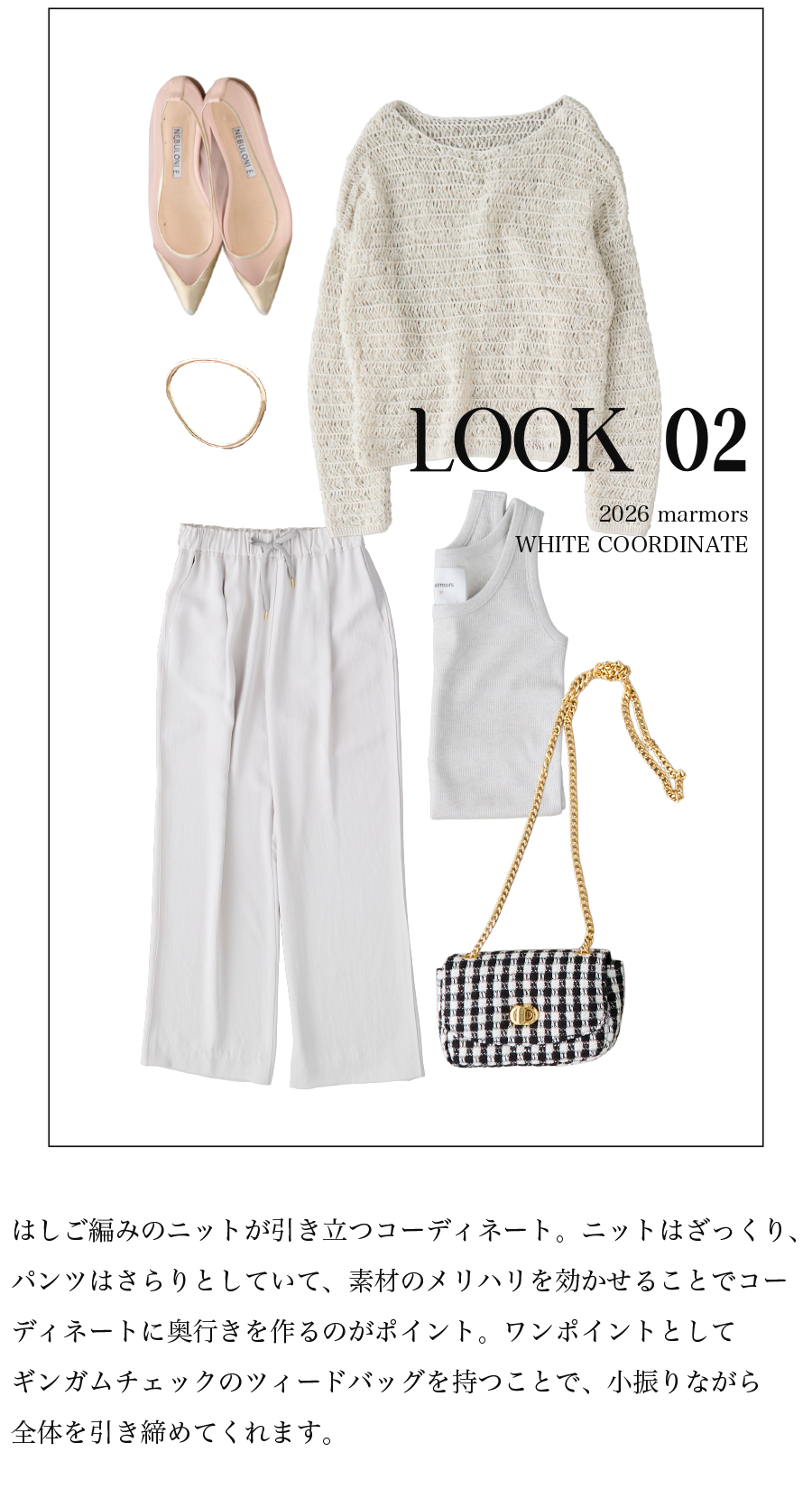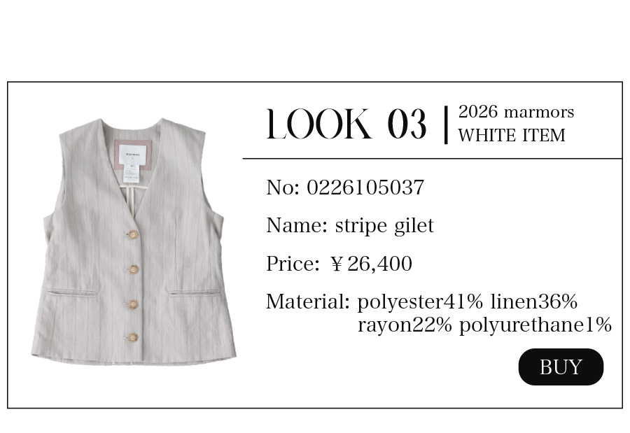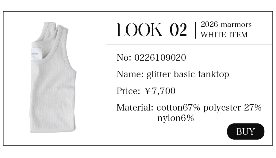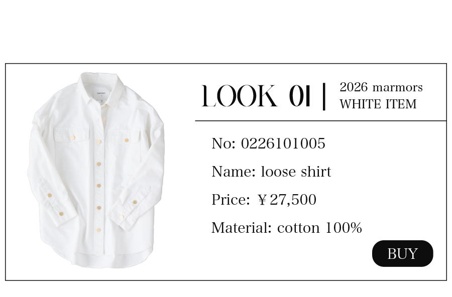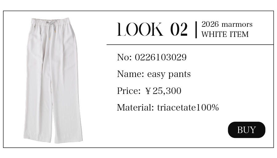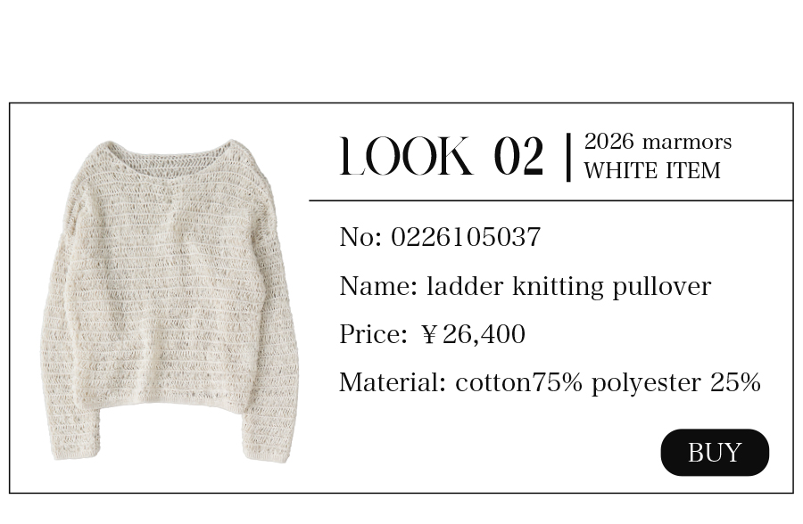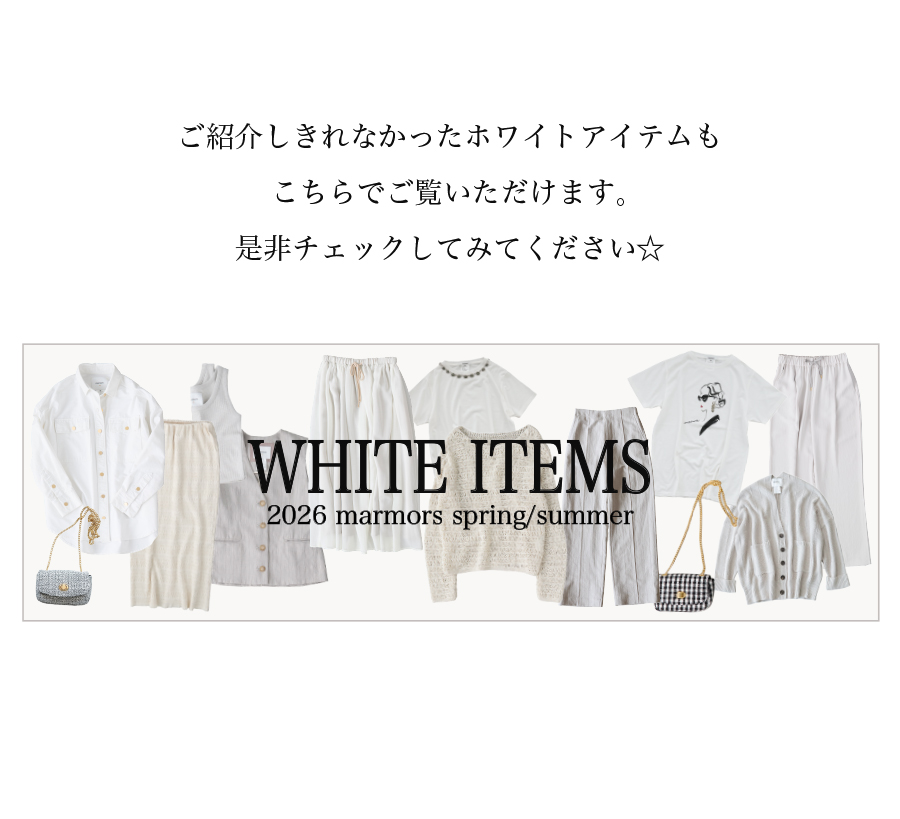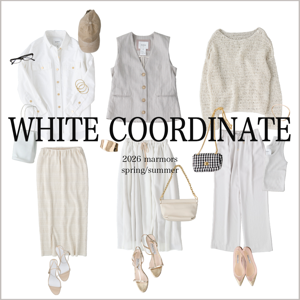 2026.04.15 【marmors】WHITE COORDINATE 爽やかで上品なホワイトコーディネート。 絶妙な色の重なりや、異なる素材を 組み合わせて奥行きを作ることで 単調にならず、洗練されたこなれ感が生まれます。 今季のmarmorsアイテムを使ったホワイトコーデを 3コーデご紹介します。