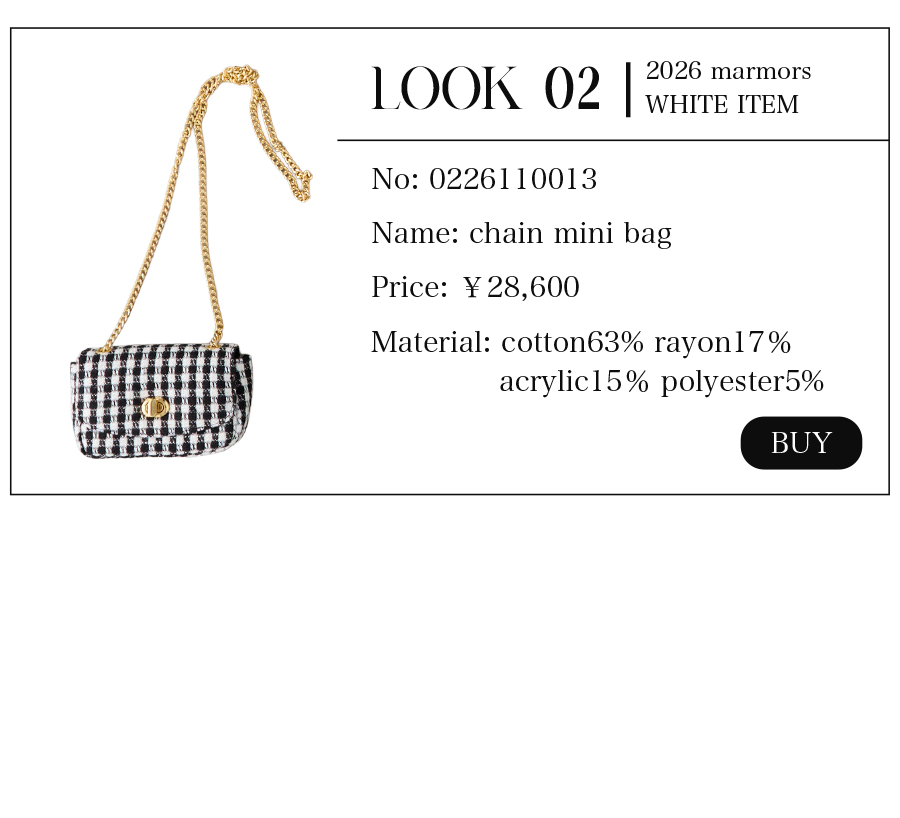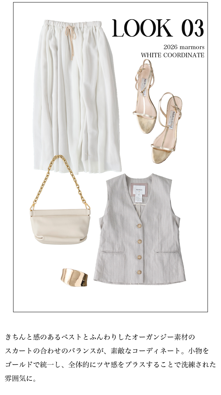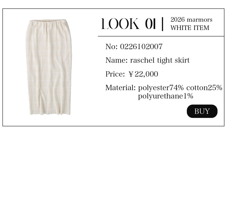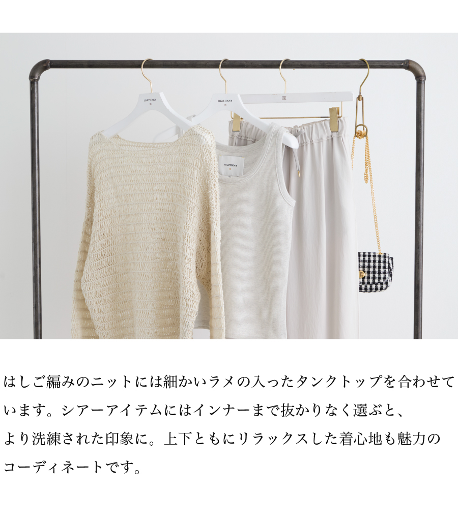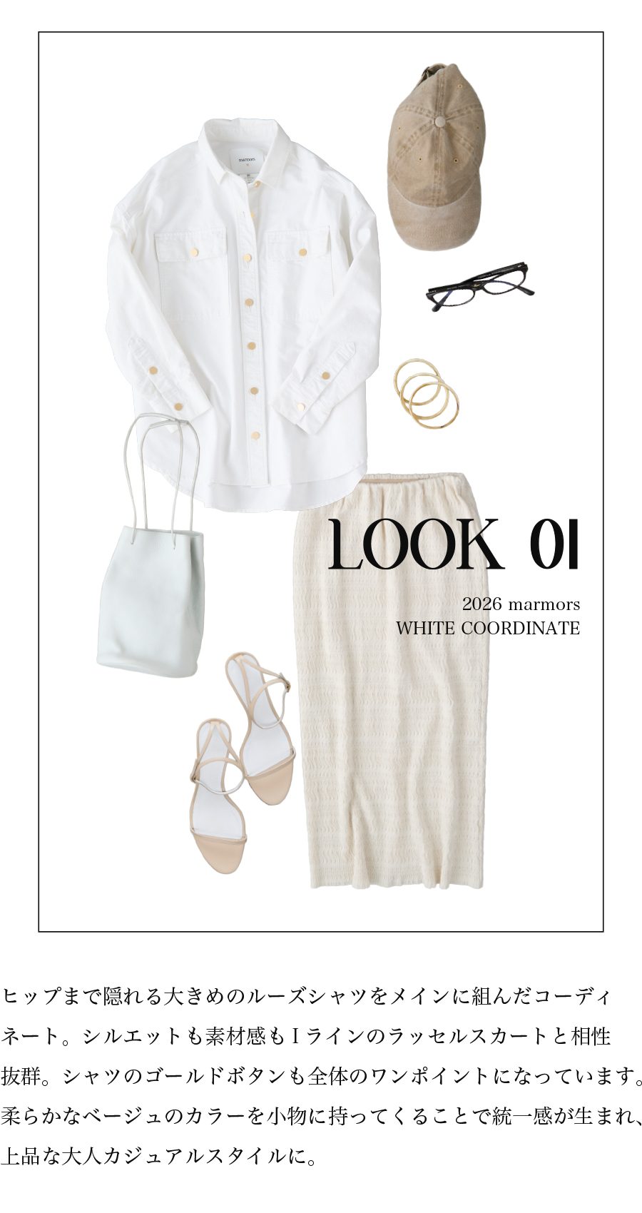2026.04.15 【marmors】WHITE COORDINATE 爽やかで上品なホワイトコーディネート。 絶妙な色の重なりや、異なる素材を 組み合わせて奥行きを作ることで 単調にならず、洗練されたこなれ感が生まれます。 今季のmarmorsアイテムを使ったホワイトコーデを 3コーデご紹介します。