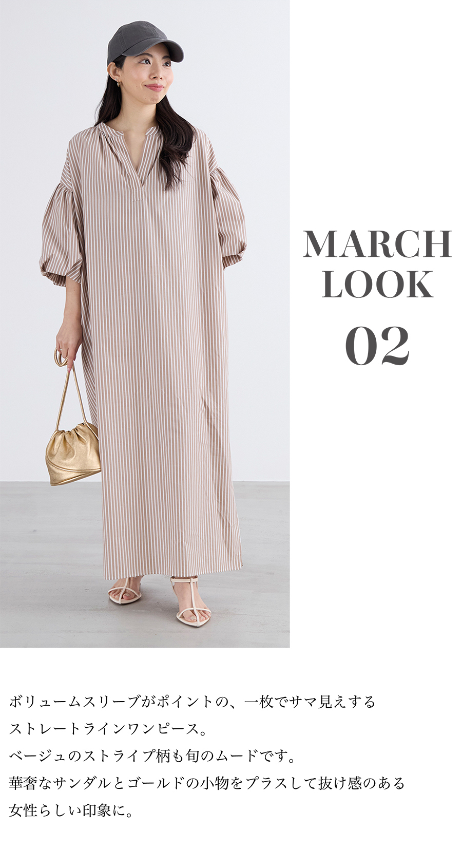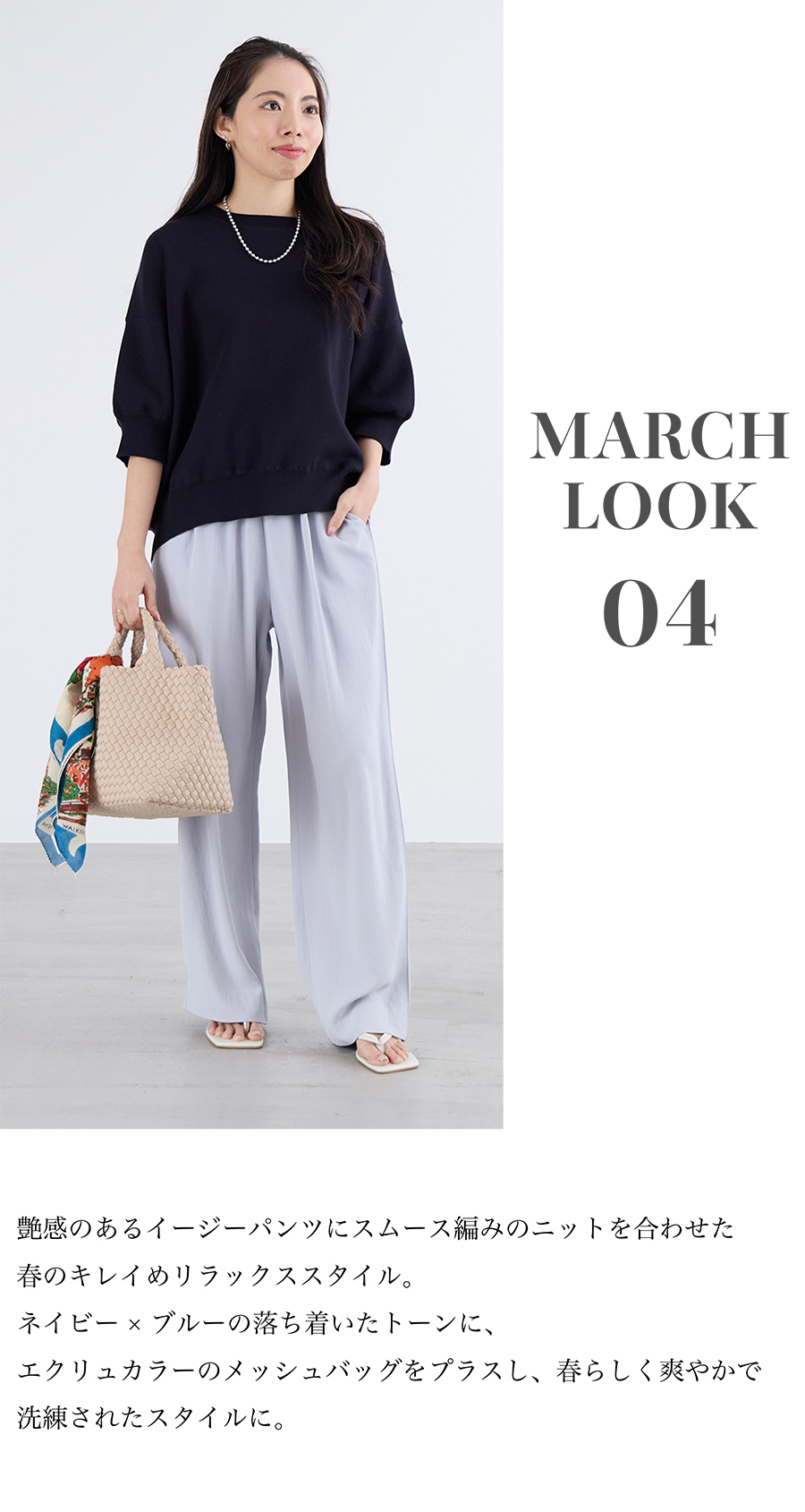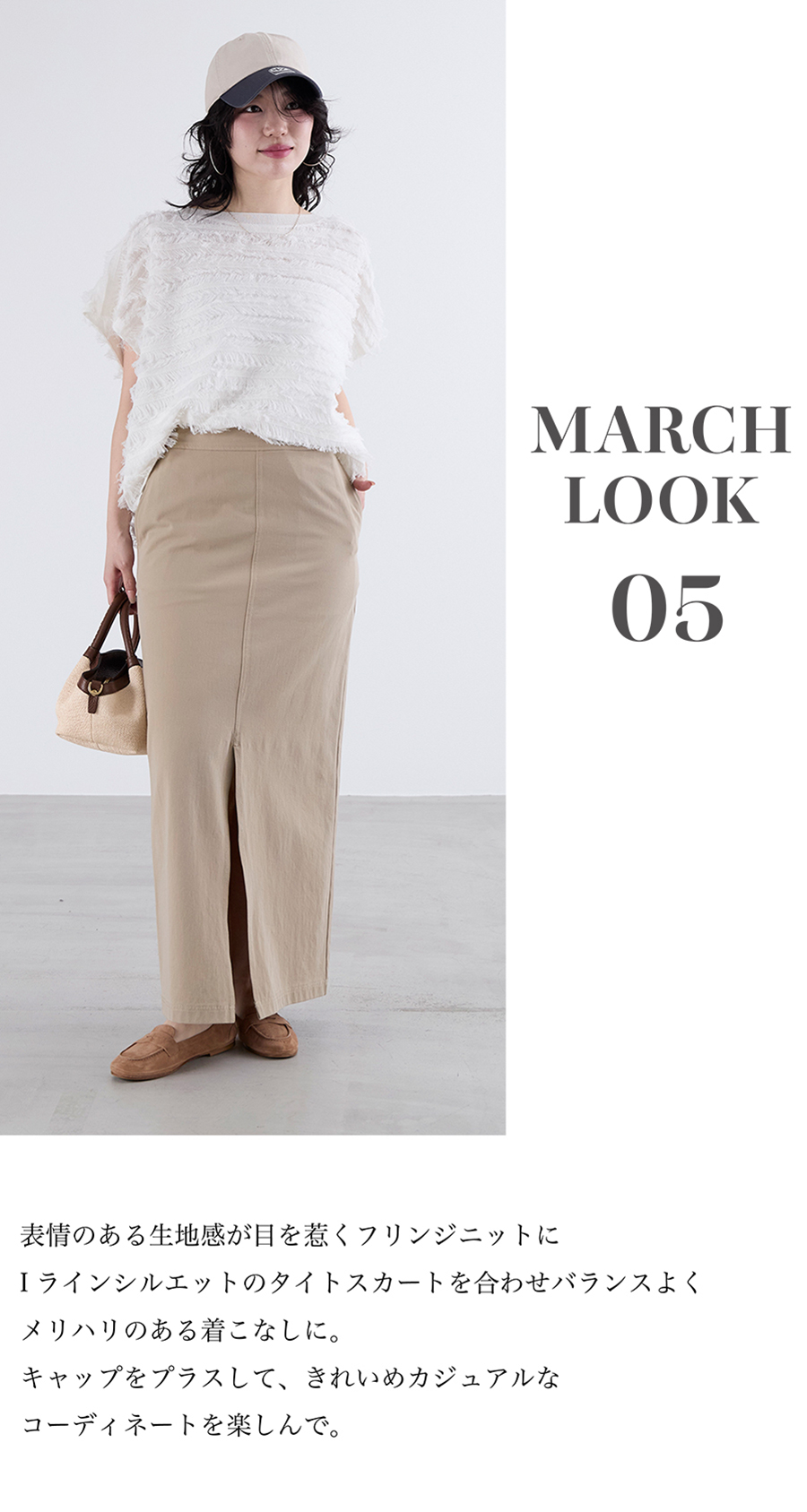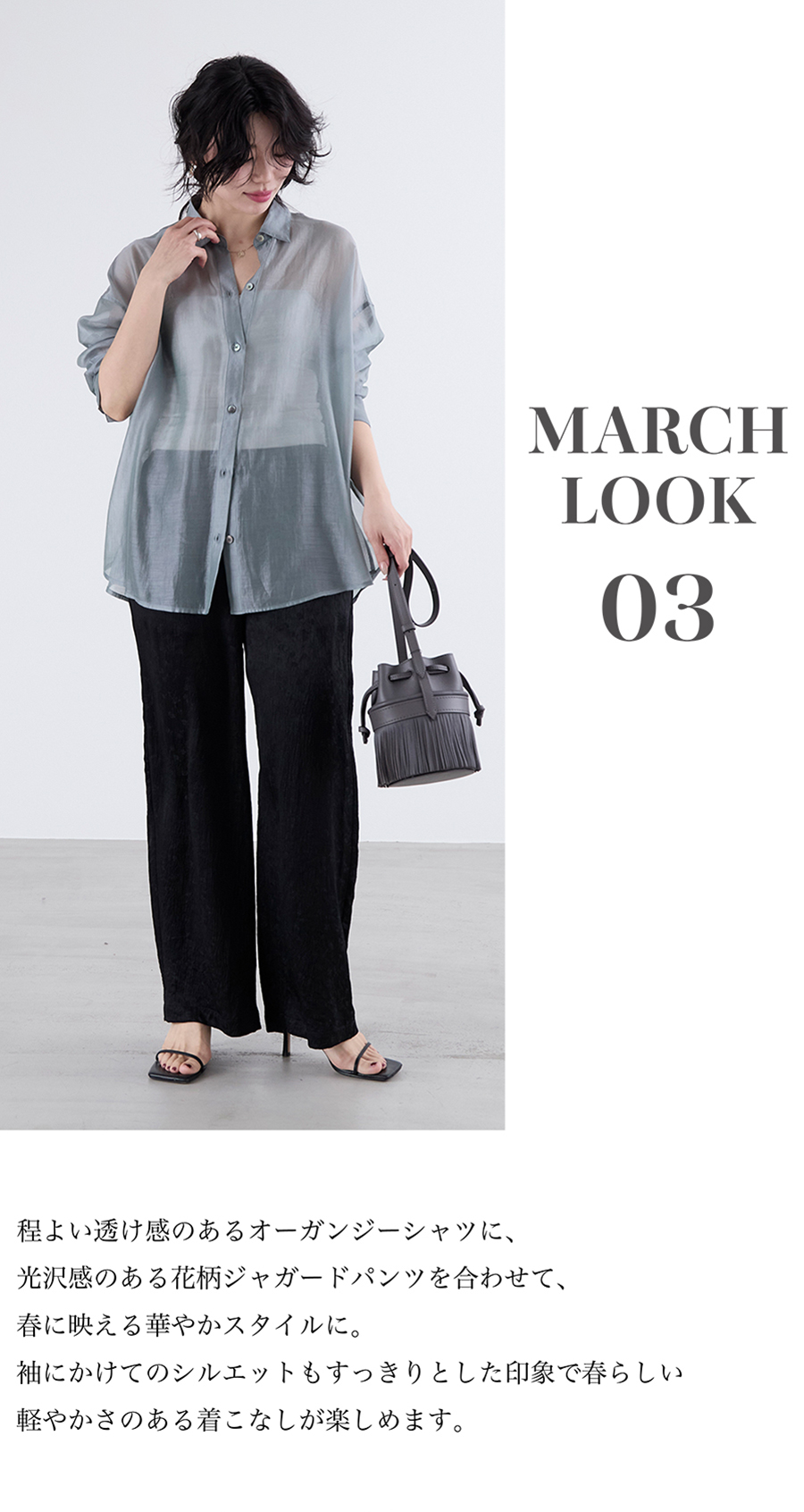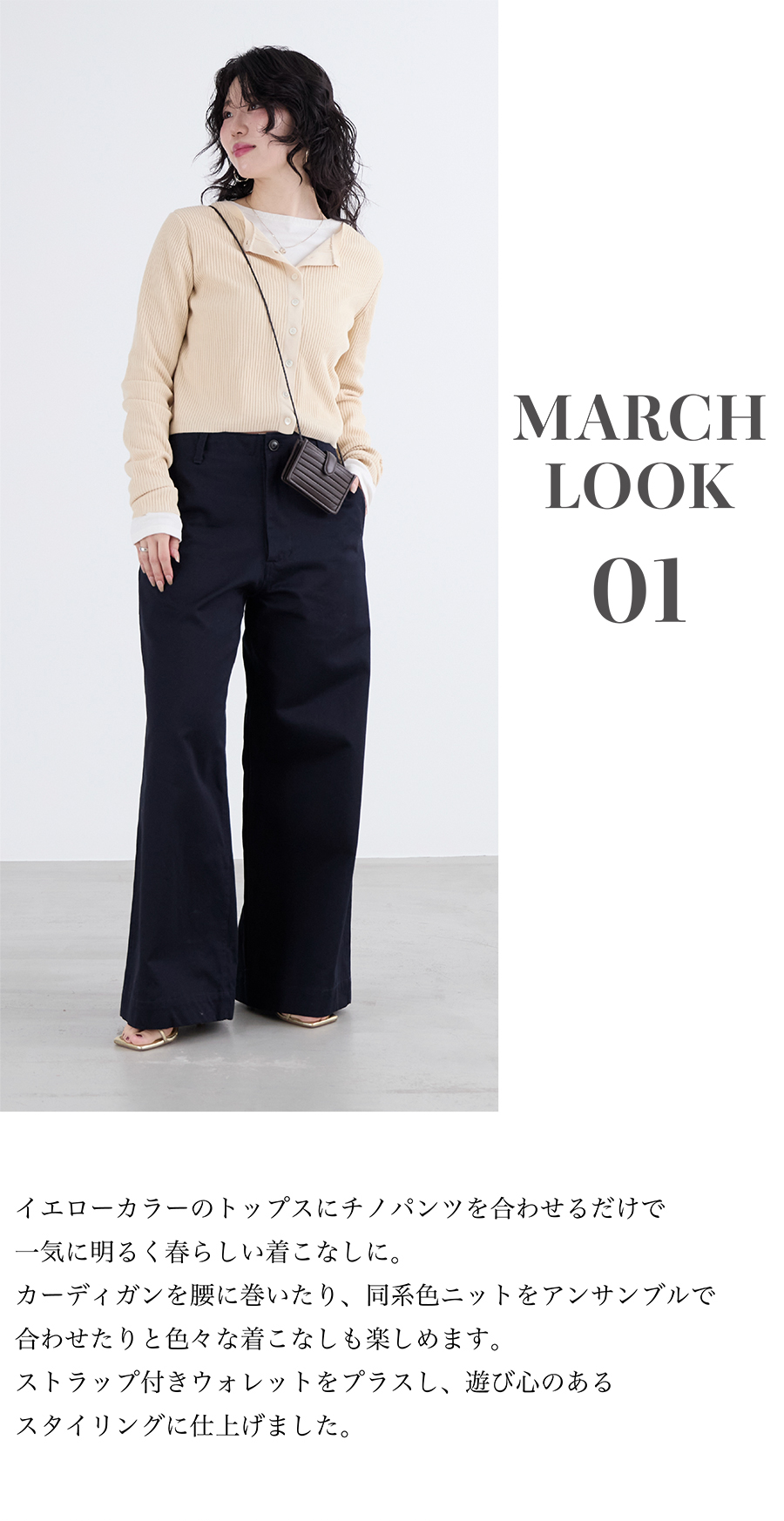 2026.03.10 【5LOOKS MARCH 】3月におすすめのスタイル 3月におすすめの5スタイルをご紹介。 春にピッタリなカラーアイテムや、 一枚で着映えするワンピース、 シアーシャツなどが登場です。 デイリーにもお出かけにも活躍する 春のスタイリングをぜひチェックしてみてください。